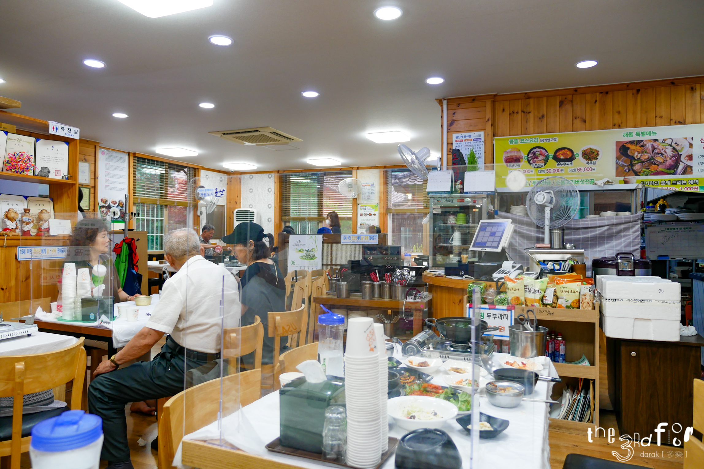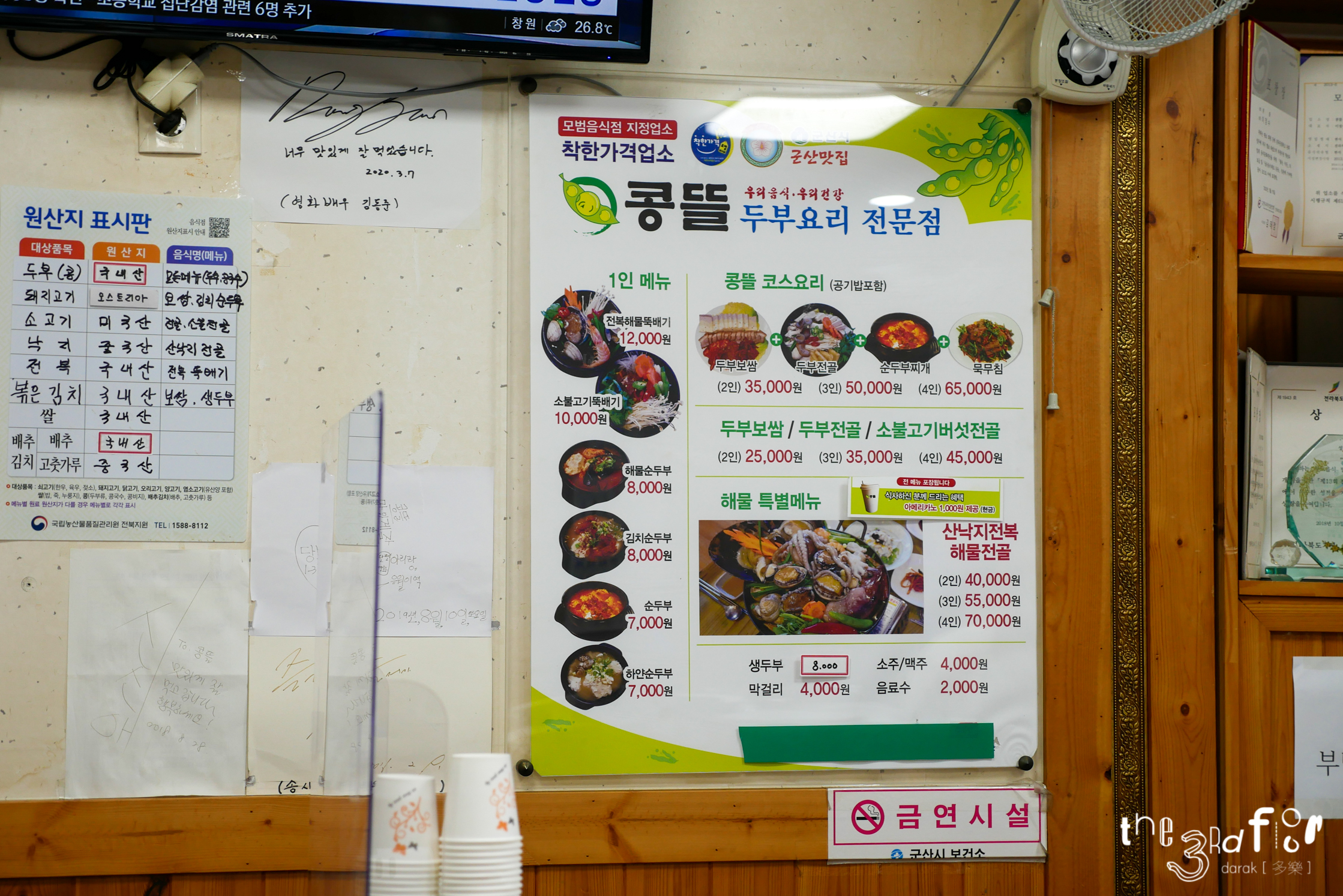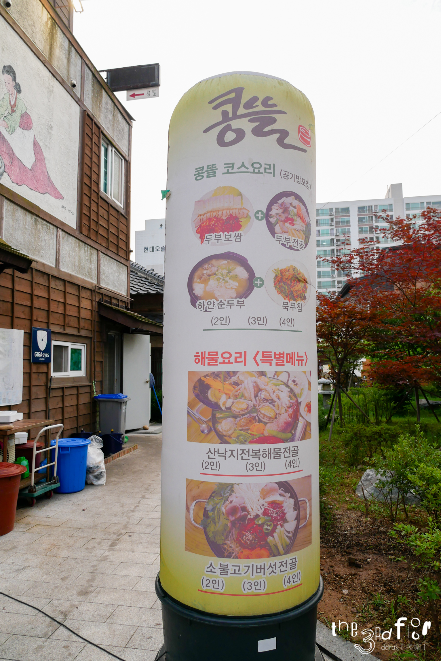 2021년이라 1인메뉴와 코스요리, 해물 특별메뉴만 있는데 지금은 코스요리를 콩밥상이라는 이름으로 바꾸고 꽃게장 정식이 들어간 특별 코스요리도 생겼다고 한다. 해물 특별메뉴는 두부보쌈과 묵무침을 추가한 후 바다밥상이란 이름으로 바뀜.