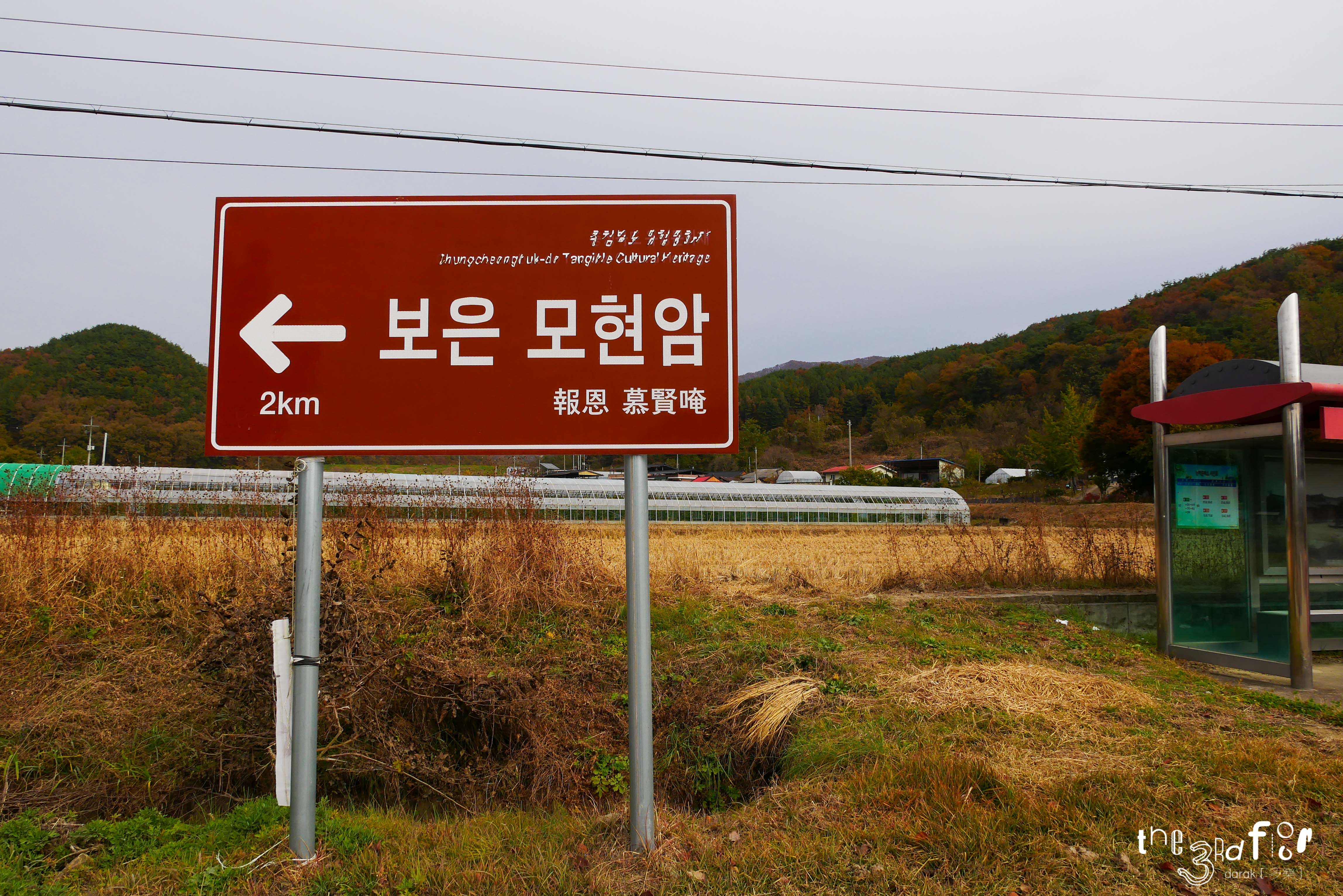 문 왼쪽에 모현암까지 2km 남았다고 알려주는 안내판과 버스정류장.