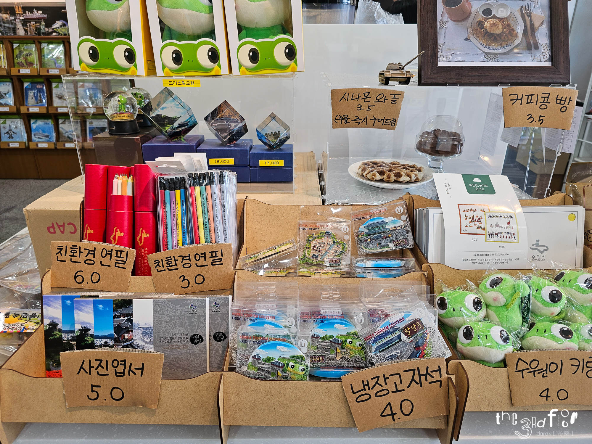 수원의 마스코트인 수원이! 수원 청개구리를 모티브로 한 귀여운 친구를 내세워서 냉장고 자석과 스노우볼 등 여러가지를 판매하고 있다.