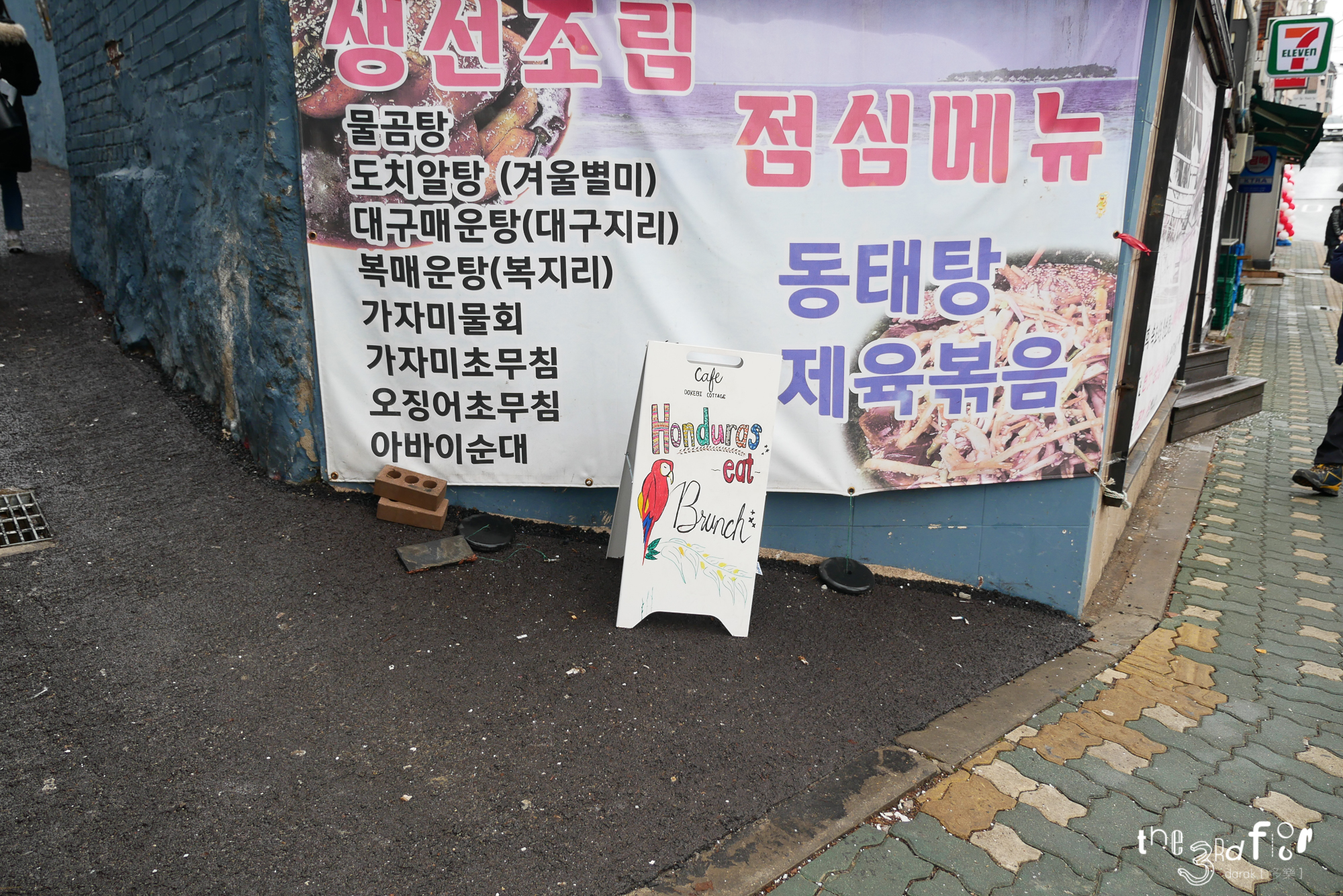 위치가 어드메뇨? E를 따라 총총 걸어가다보니 골목에 온두라스 브런치를 먹을 수 있다고 알려주는