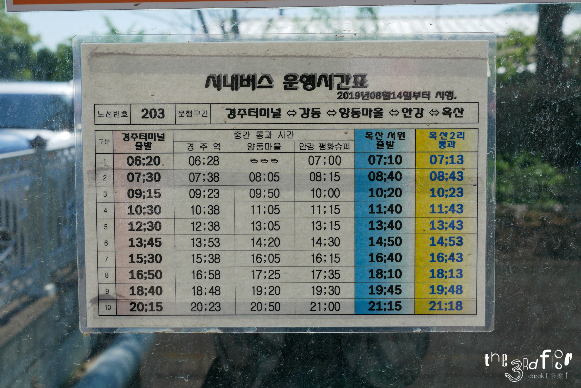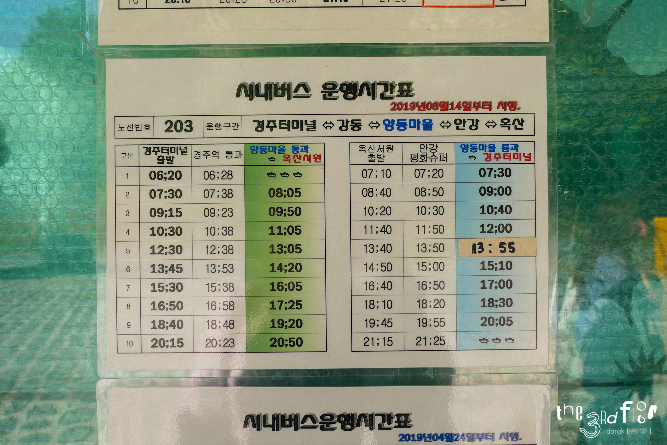 우리는 경주역(폐역) 근처 성동시장 동편 정류장에서 12시 40분쯤 도착한 버스를 타고 출발했다. 이 시간에 출발해도 옥산서원과 양동마을을 모두 둘러보는 데 전혀 무리가 없었다. 아주 느긋하고 여유로운 일정이었음.