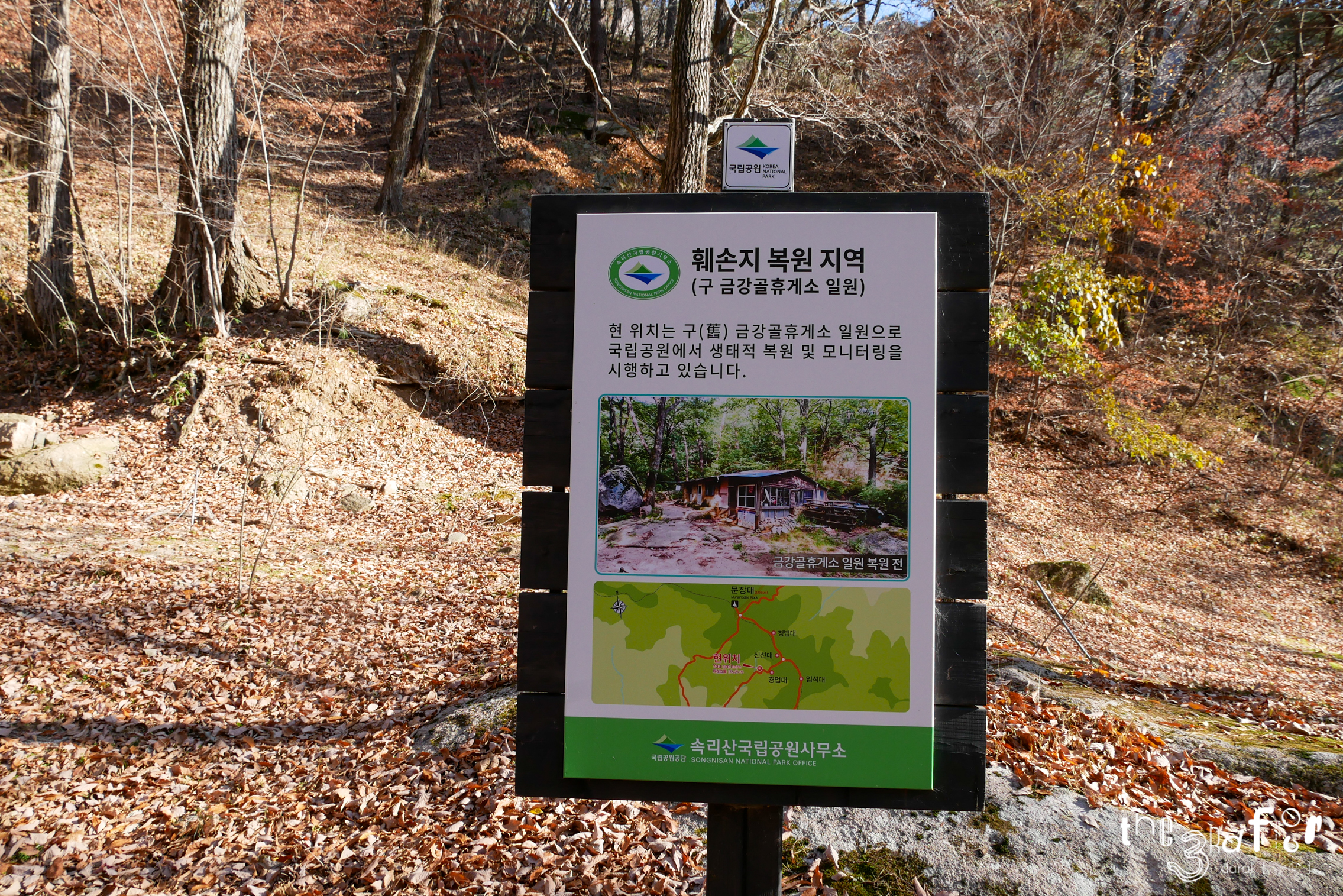 금강골 휴게소였던 곳을 발견. 속리산 국립공원에 있었던 여러 사설 휴게소는 다 철거되고 신선대 하나만 남았다더니, 그 흔적중 하나를 볼 수 있었다. 문장대 올라가는 길에 있던 휴게소도 사라졌던데... 국립공원을 위해서는 치우는 게 맞겠지만 산 속에서 주전부리 먹을 만한 곳이 많이 사라져서 아쉽기도 하다. (이유: 내 체력이 별로라 먹을 걸 이고지고 가는 게 힘드러용)