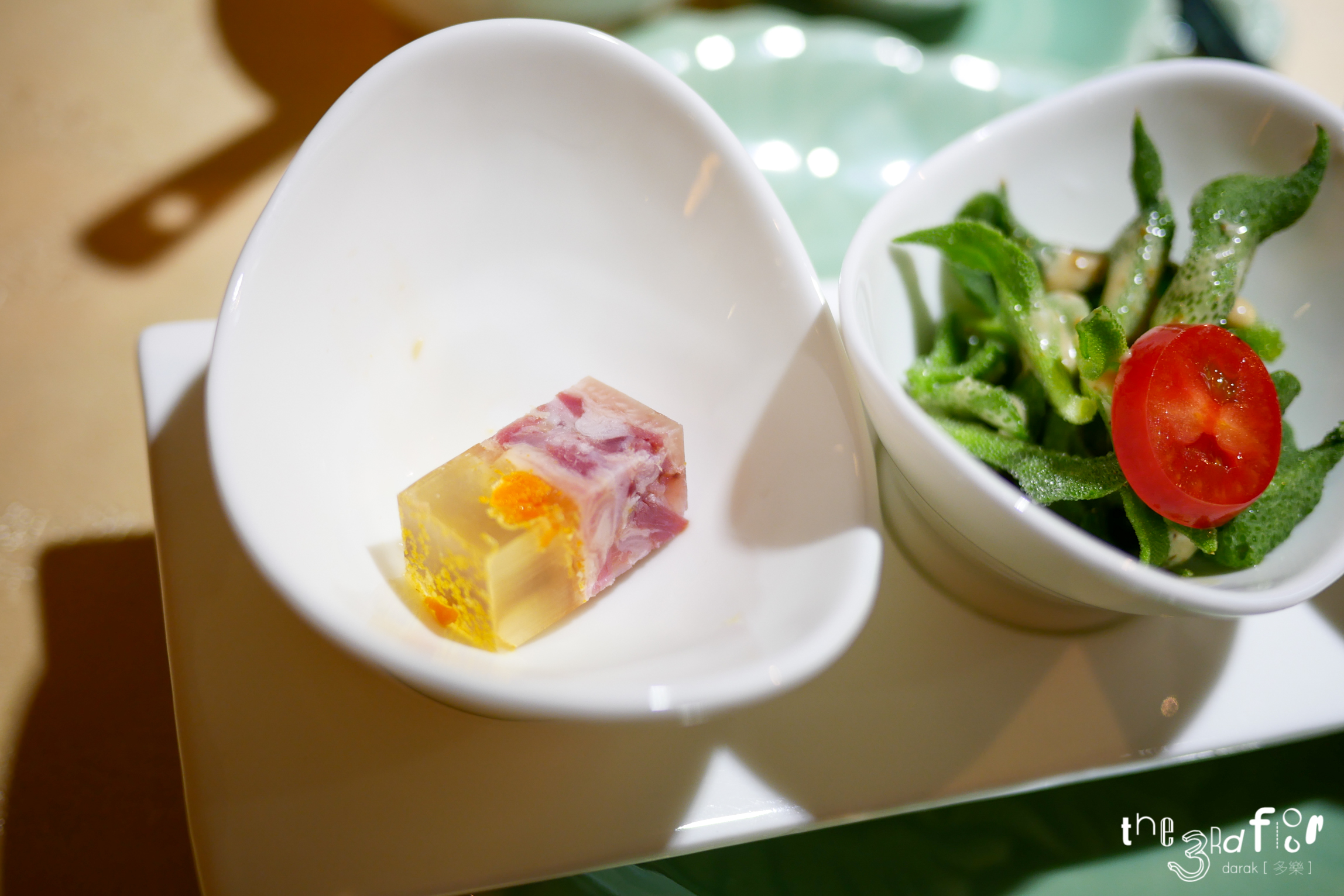 가장 처음, 애피타이저로 나온 냉채 3종류. 첫번째 것은 돼지고기 젤리, 다른 하나는 샐러드, 나머지는 해파리 절임이었다.