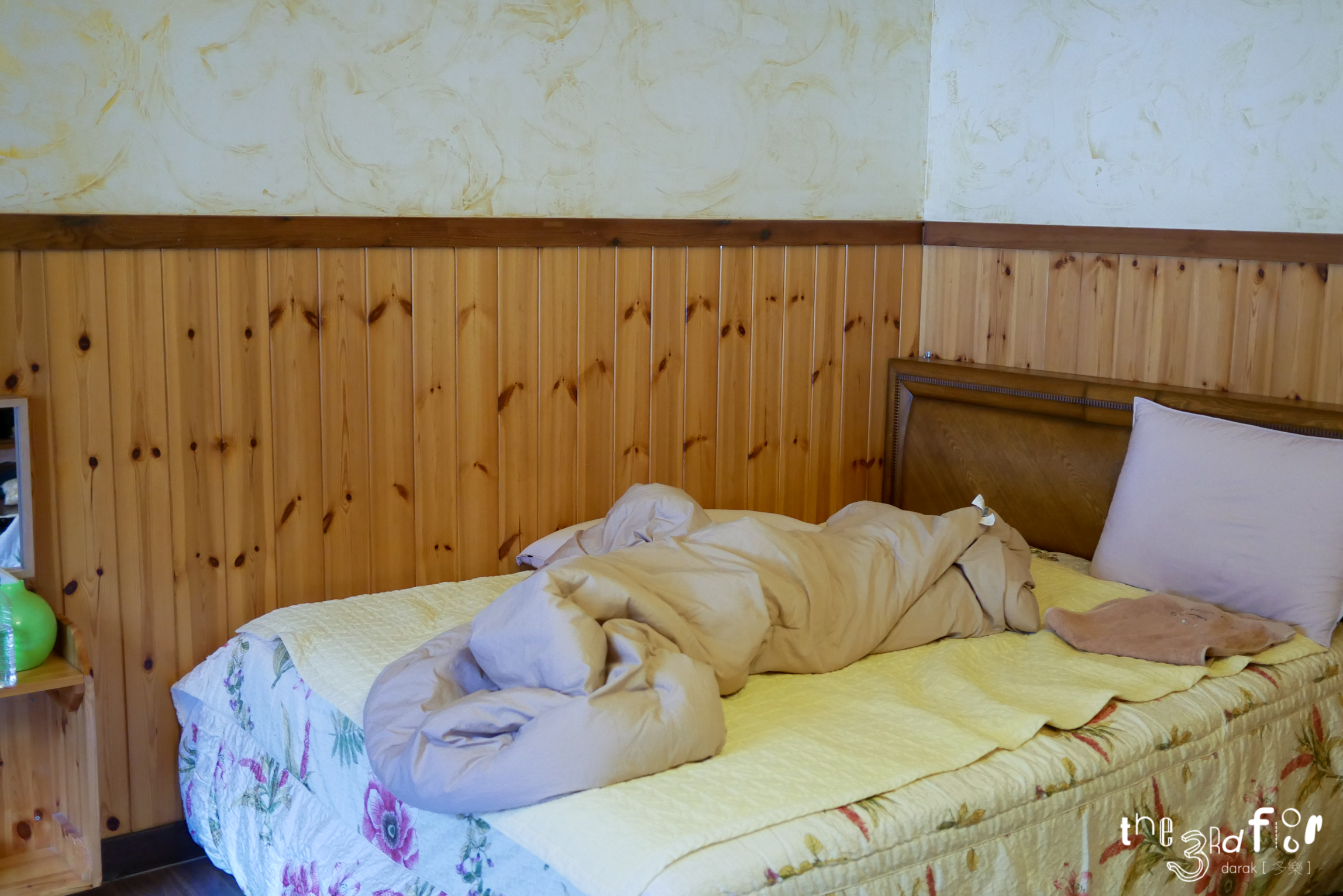 나랑 언니는 침대에서 붙어서 자고 호메는 바닥에서 잤다.