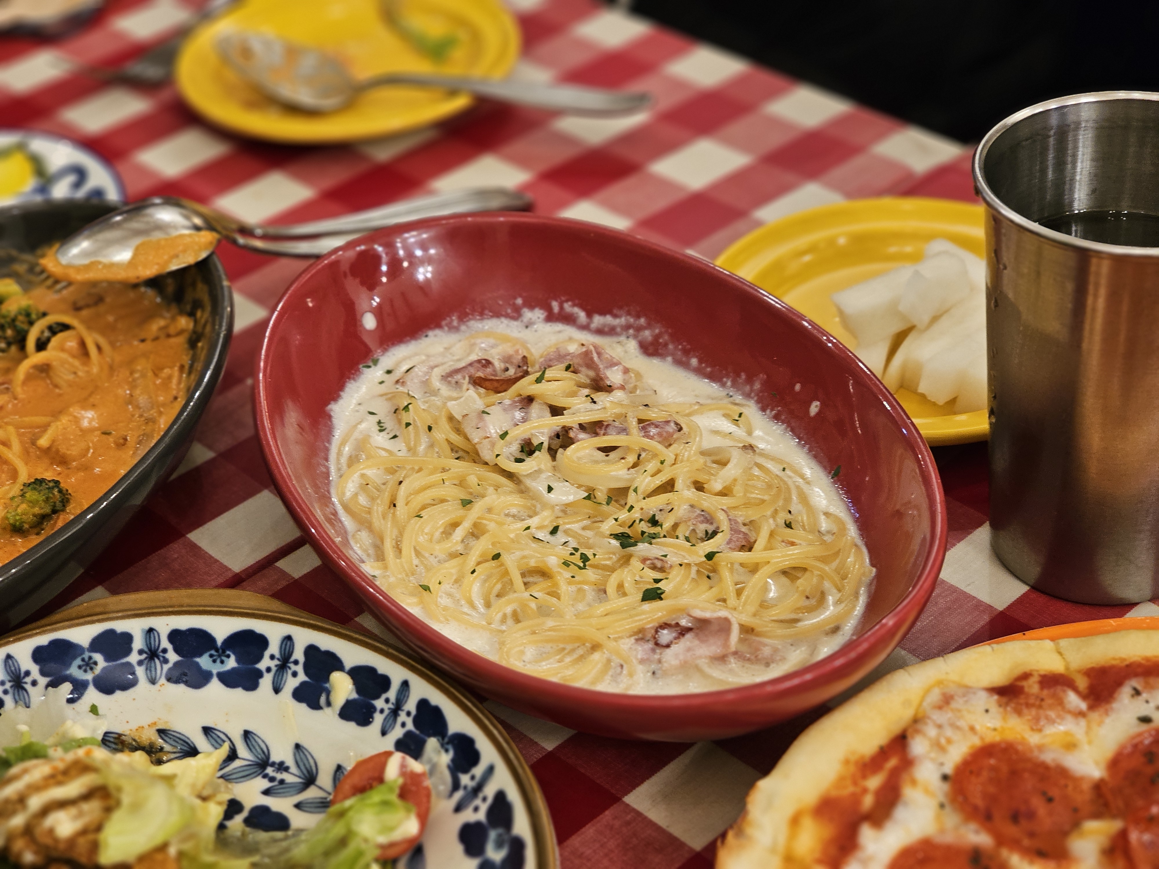 가장 기본적인 까르보나라! 소스를 많이 넣어줘서 아이들도 좋아할 것 같은 옛날 경양식집 맛이다.