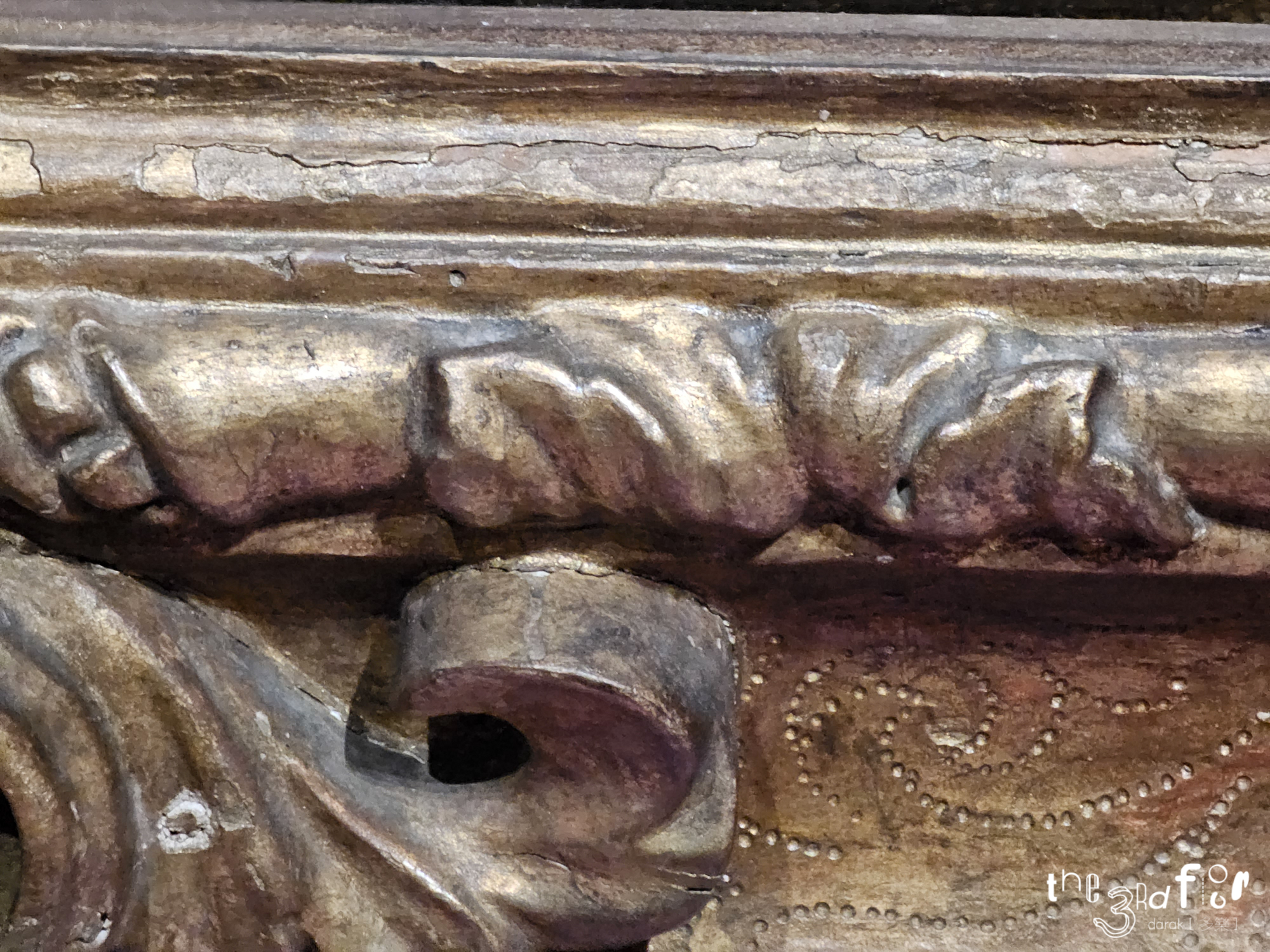 조화로운 배치와 부드러운 표현으로 이름난 라파엘로답게 성모 마리아와 아기 예수, 세례자 요한을 안정적인 구도로 그렸다. 사실 개인적으로 난 종교화에 큰 관심은 없는 편이지만 이 작품의 경우 액자가 매우 눈에 띄었기 때문에 아니 볼 수가 없었다. 해당 액자는 르네상스 시대 이탈리아에서 제작된 것으로, 당시 제단화나 성모자 그림에 사용되던 전통적인 장식 액자 형태를 보여주는 사례이다. 특히 액자의 상단과 가장자리에는 장식 패턴이 조각되어 있어 그림을 둘러싼 장식적 역할을 하면서 동시에 작품의 종교적 분위기를 강조한다. 이 시대에는 그림과 액자가 하나의 제단 장식처럼 함께 제작되는 경우가 많았기 때문에 액자 역시 작품의 일부처럼 여겨지기도 했다고.