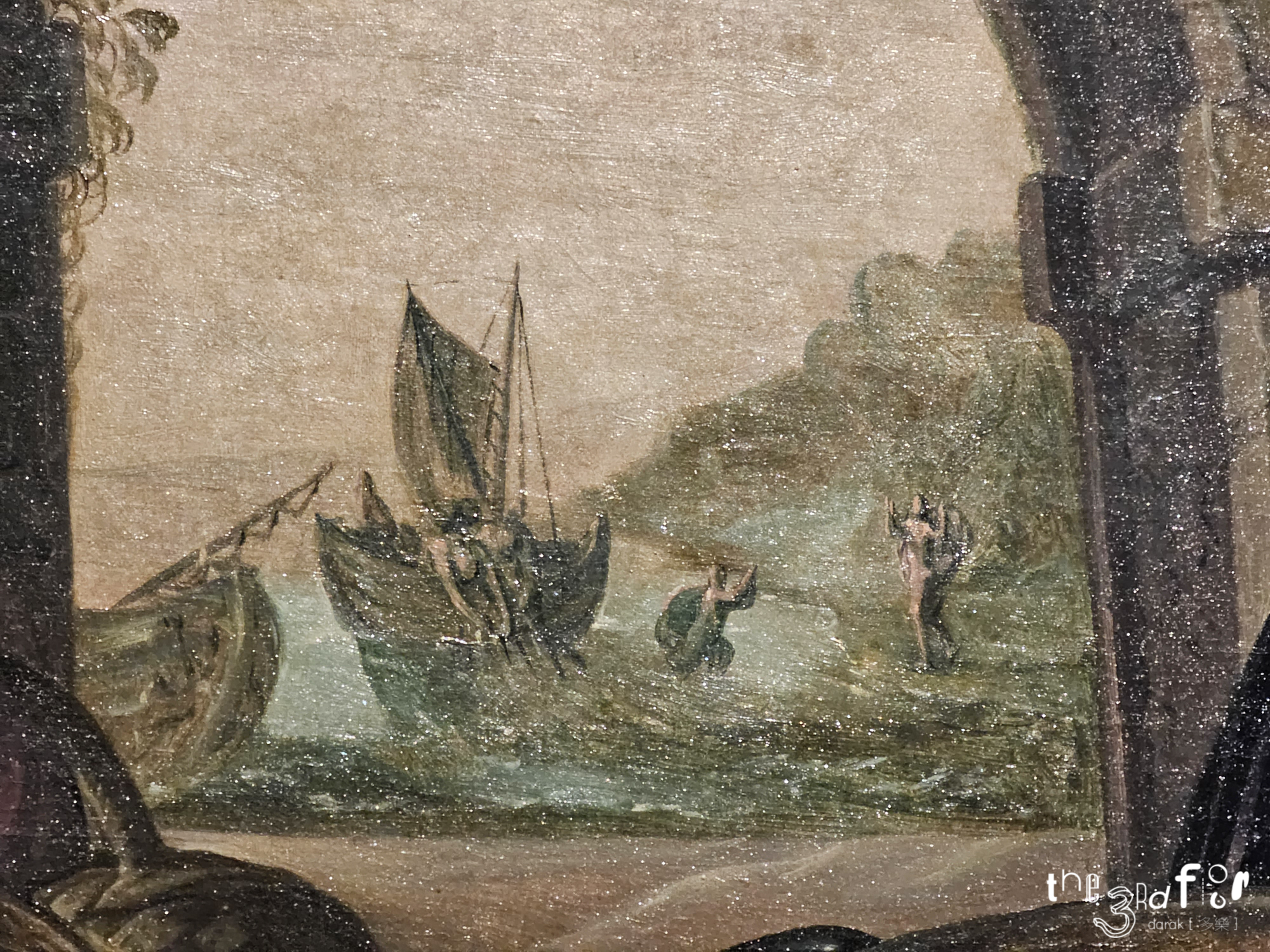 이 작품은 요아킴 베켈라르 <4대 원소 : 물> 의 일부분으로, 풀 샷에는 등장인물들이 생선 손질을 하는 모습을 매우 사실적으로 그렸다. 서민 친화적인 주제로 그간 그렸던 종교화나 초상화는 결이 다른 그림이다. 이 부분은 성경 속 예수님이 물고기를 많이 잡게 하는, 풍어의 기적을 아주 자그마하게 (마치 이스터 에그처럼) 그린 것이다. 원본 그림은 너무 사실적이라 내취향은 아니었는데 이런 숨은 그림이 있어서 재밌었다 ㅋㅋㅋ