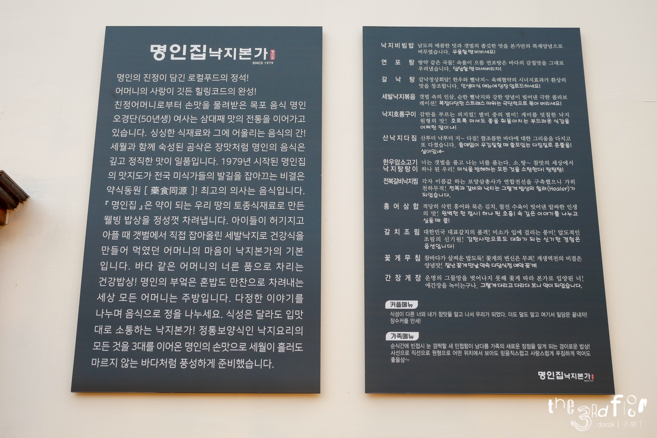 결국 주문한 메뉴는 세발낙지볶음과 갈낙탕. 인원이 셋인데 메뉴가 두 개 뿐인 이유는, 낙지볶음과 낙지초무침은 최소 2인분부터 주문이 가능하다고 해서였다. 낙지볶음 3만 8천원, 갈낙탕 2만 5천원으로 가격이 저렴한 편이 아니어서 최소 주문 수량이 있다는 사실에 조금 놀랐음...
