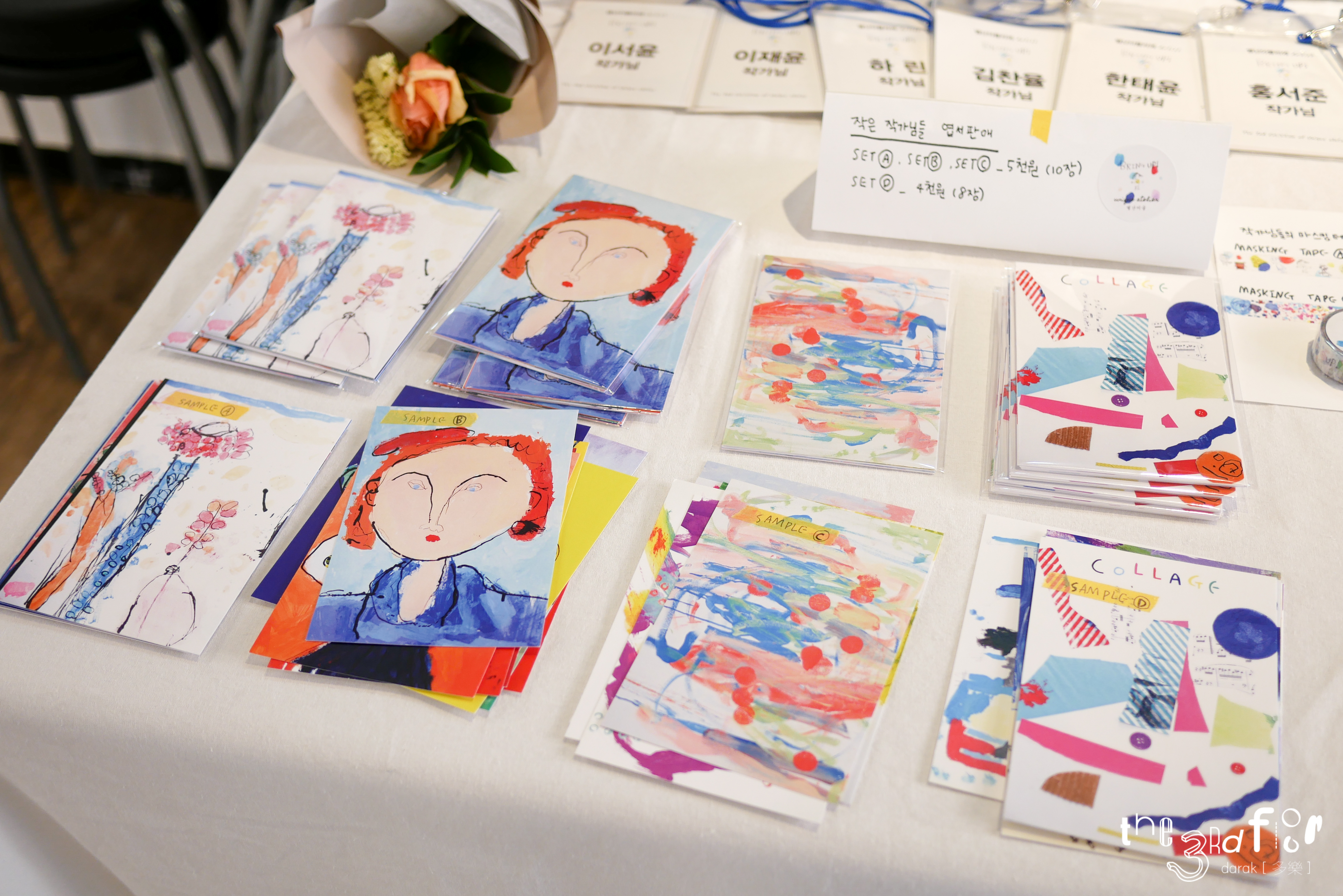 골목을 걸어가는데 묘한 전시회가 열리고 있길래 들어가보았다. 혹시 엽서를 판매하지 않을까? 싶어서 가본건데 역시나! 어린이들의 작품을 엽서로 만들어 판매하고 있었다. ㅋㅋ 귀여워라.