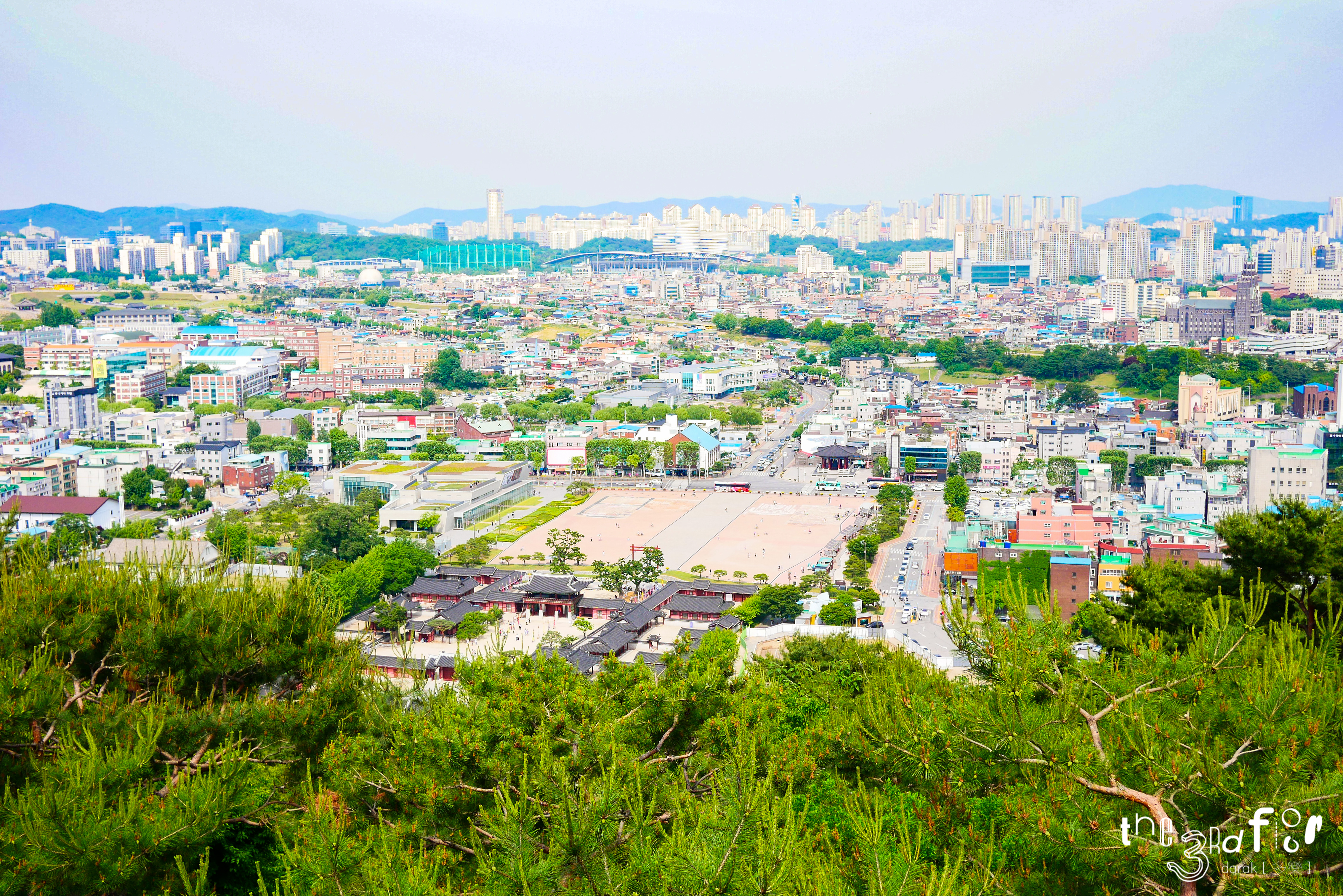 서장대에서 화성행궁 쪽을 바라보면 행궁의 전체적인 모습과 광장을 한눈에 볼 수 있다.