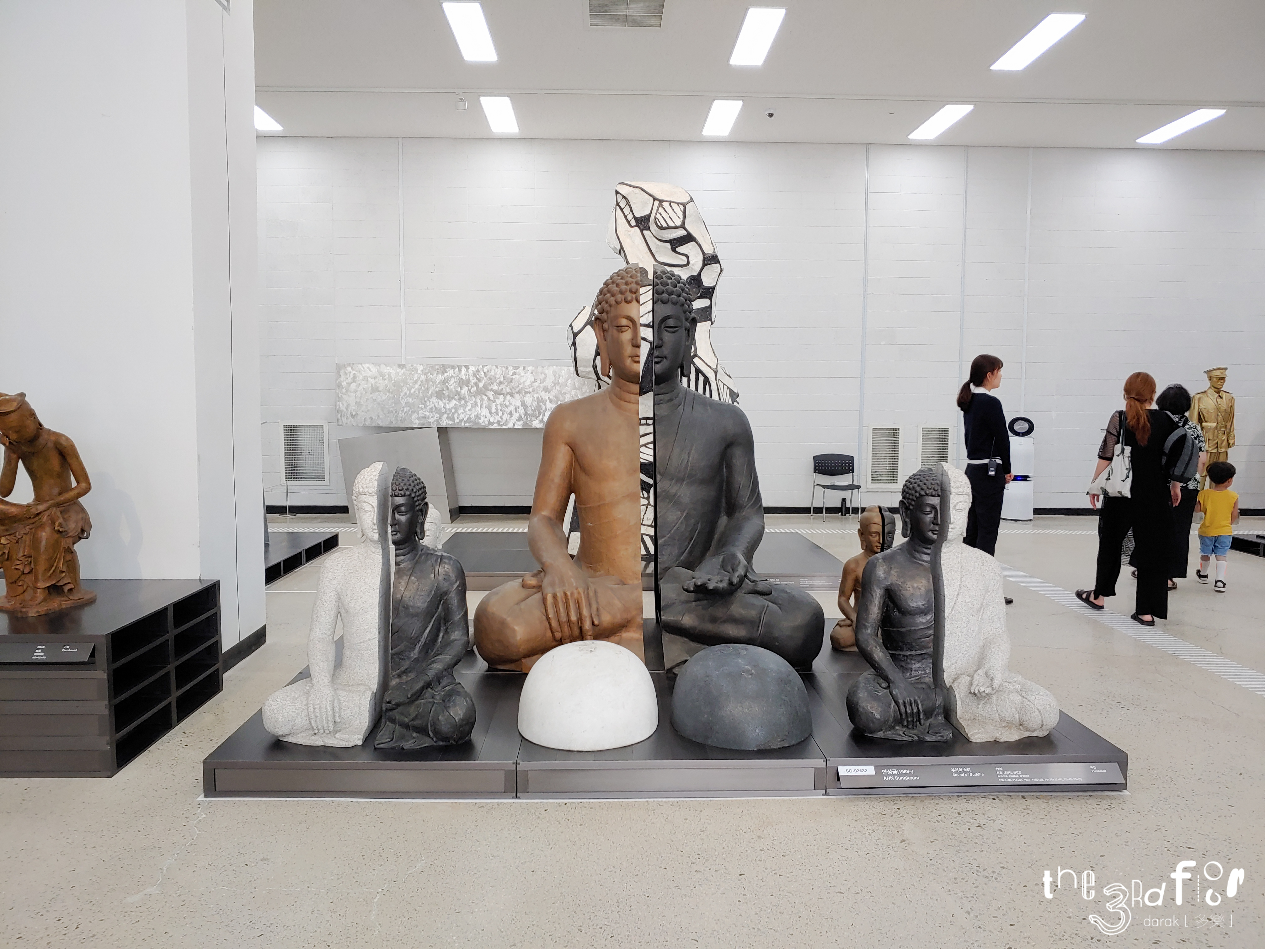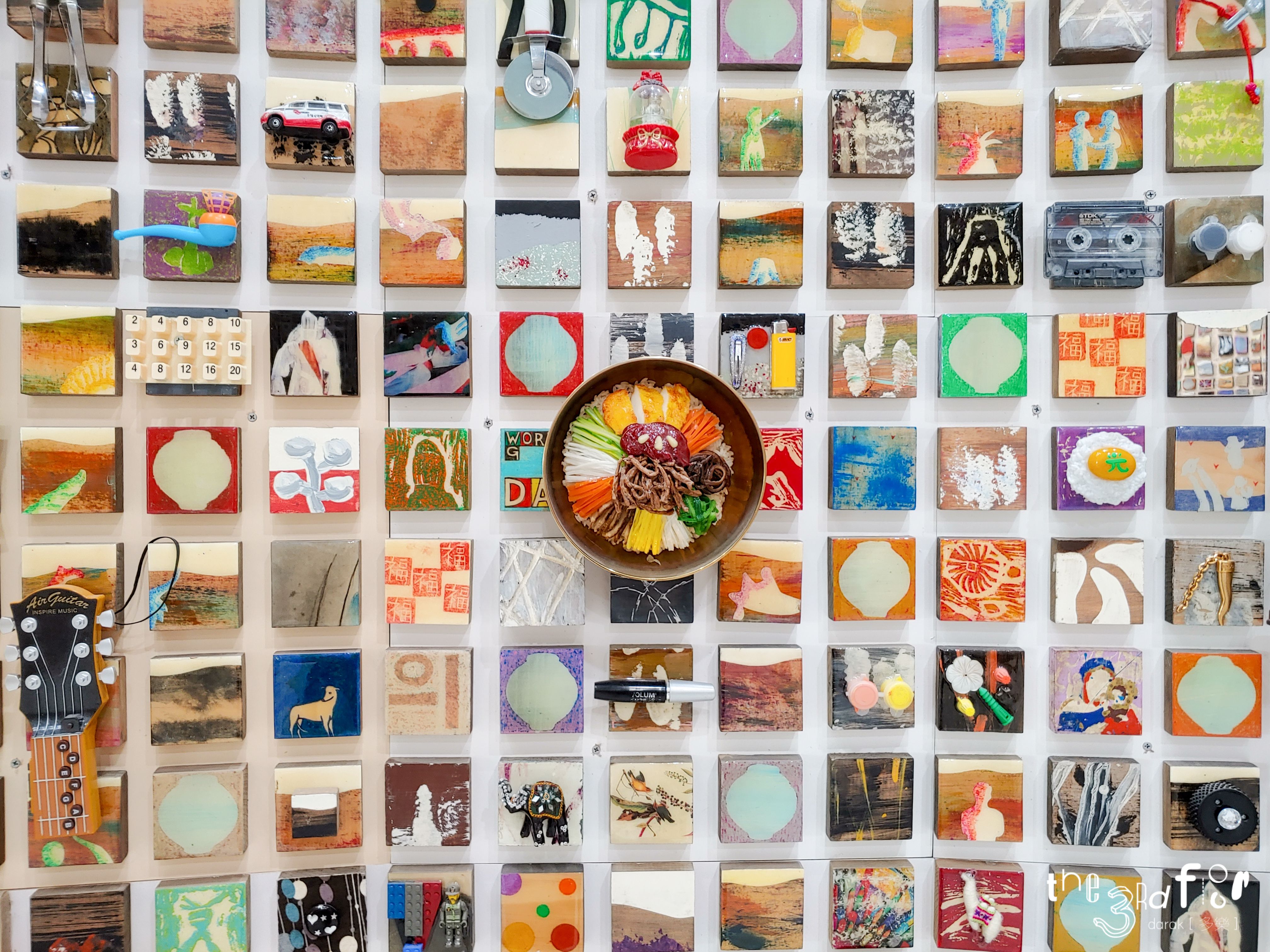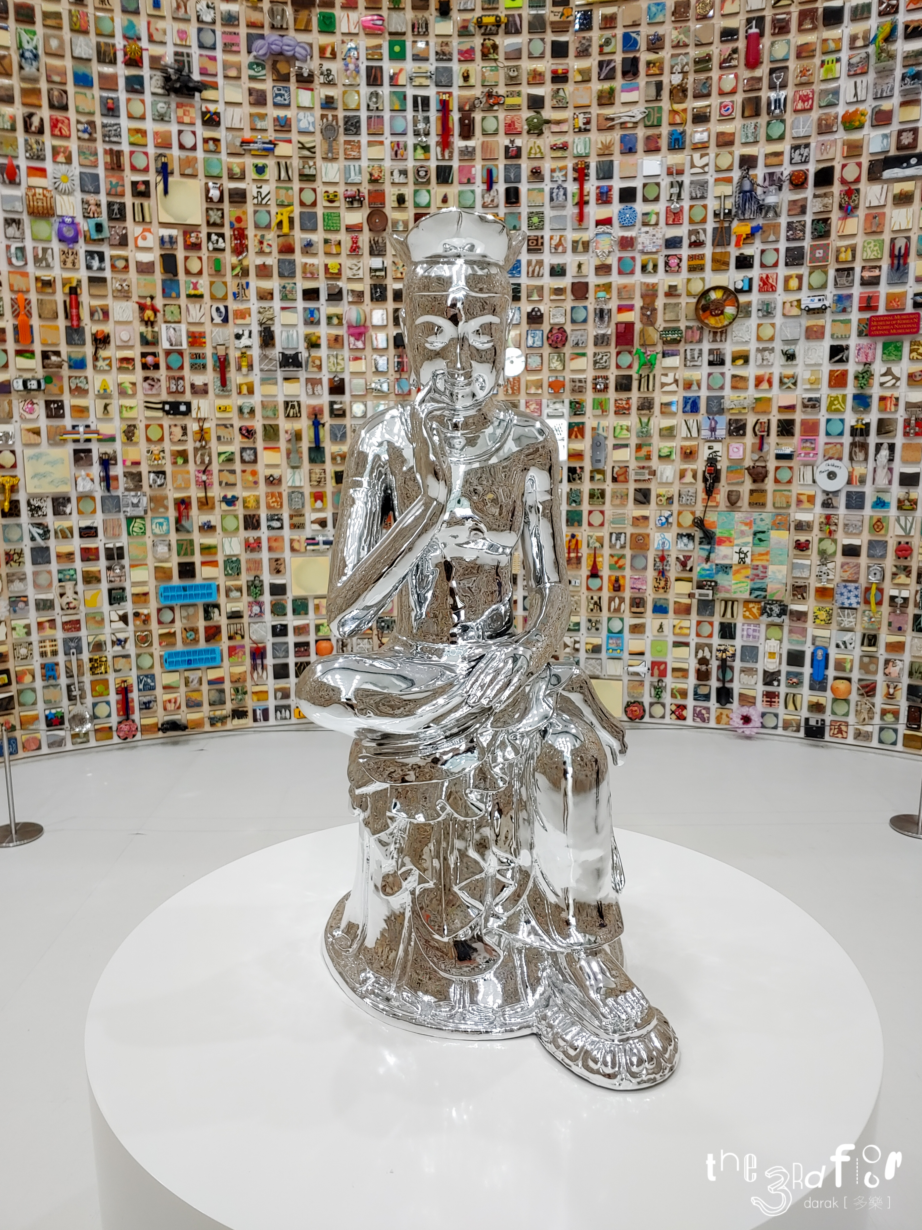가운데에 서 있는 반짝반짝한 불상. 알로록달로록한 캔버스에 담긴 그림들과는 다르게 부처는 깨끗한 크롬 도금으로 고고하다. 하지만 역시 삼라만상의 모든 것을 부처가 비춰주고 있다... 는 모티브의 작품 :)