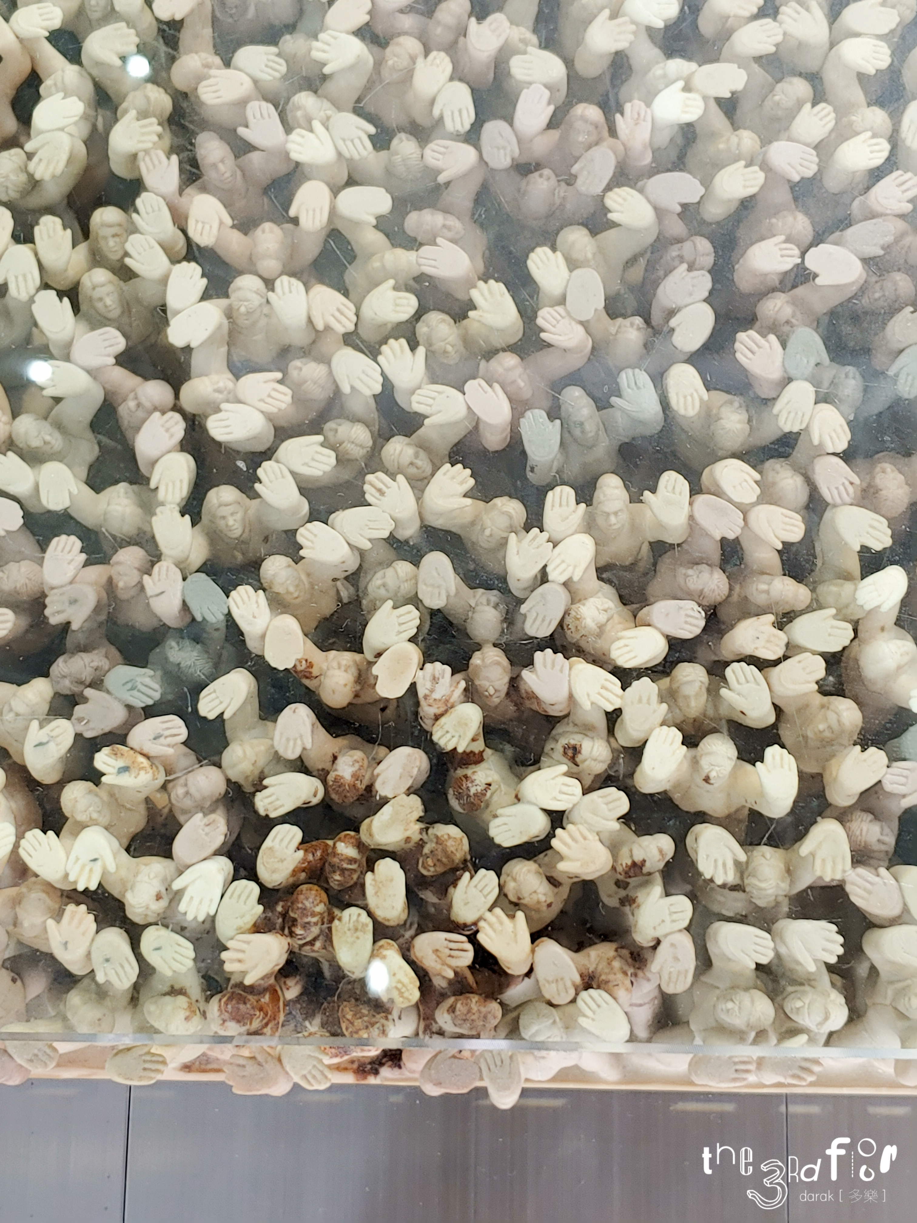 들어서자마자 보였던 설치미술 <바닥> 은 PVC로 만든 다양한 인물상들이 바닥을 받치고 있는 모습을 형상화하고 있다. 원래는 관람객들이 이 유리판 위를 거닐 수 있도록 제작하였으나 당시에는 아마 약간의 문제로 인해 막아뒀던 것으로 기억한다. 내가 딛고 있는 바닥을 수만 명의 사람들이 지탱하고 있는 모습을 보고 무슨 느낌이 드는지 고민하며 감상하는 작품.