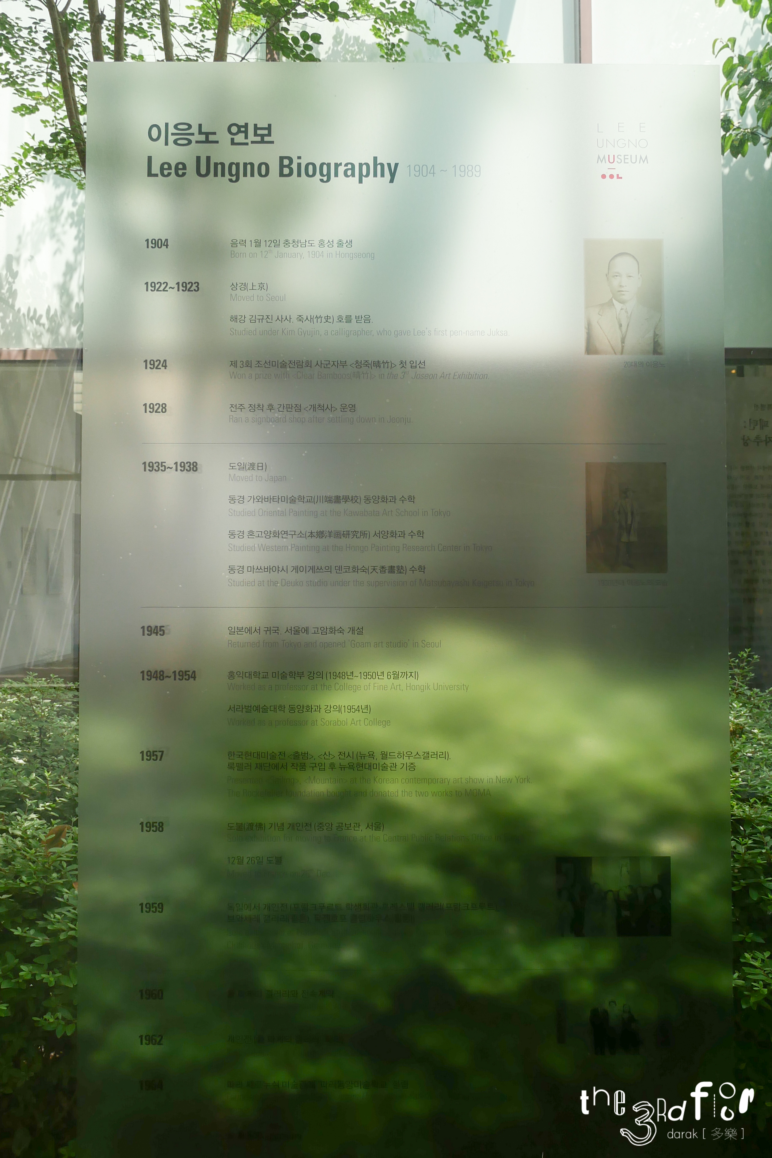 사실 이응노미술관은 2000년부터 2005년까지는 서울 평창동에서 운영되고 있었더랬다. 그 후 이응노 화백의 작품을 대전광역시가 인수하여 2007년에 이곳에 새로 개관하였다. 아내 박인경씨가 현재의 이응노미술관 명예관장인데, 이 분은 1977년의 백건우-윤정희 납치미수사건에 연루되어 읍읍. 남편은 간첩 누명을 쓰고 깜방에 다녀왔는데 아내는... 찐... 헐... 이응노 화백은 아내가 이 사건으로 해외에 나갔다 왔다는 사실조차 모르고 한국 정부의 누명이라고 반론하다가 대한민국과의 관계가 완전히 단절되어, 1983년에 프랑스로 귀화했다.