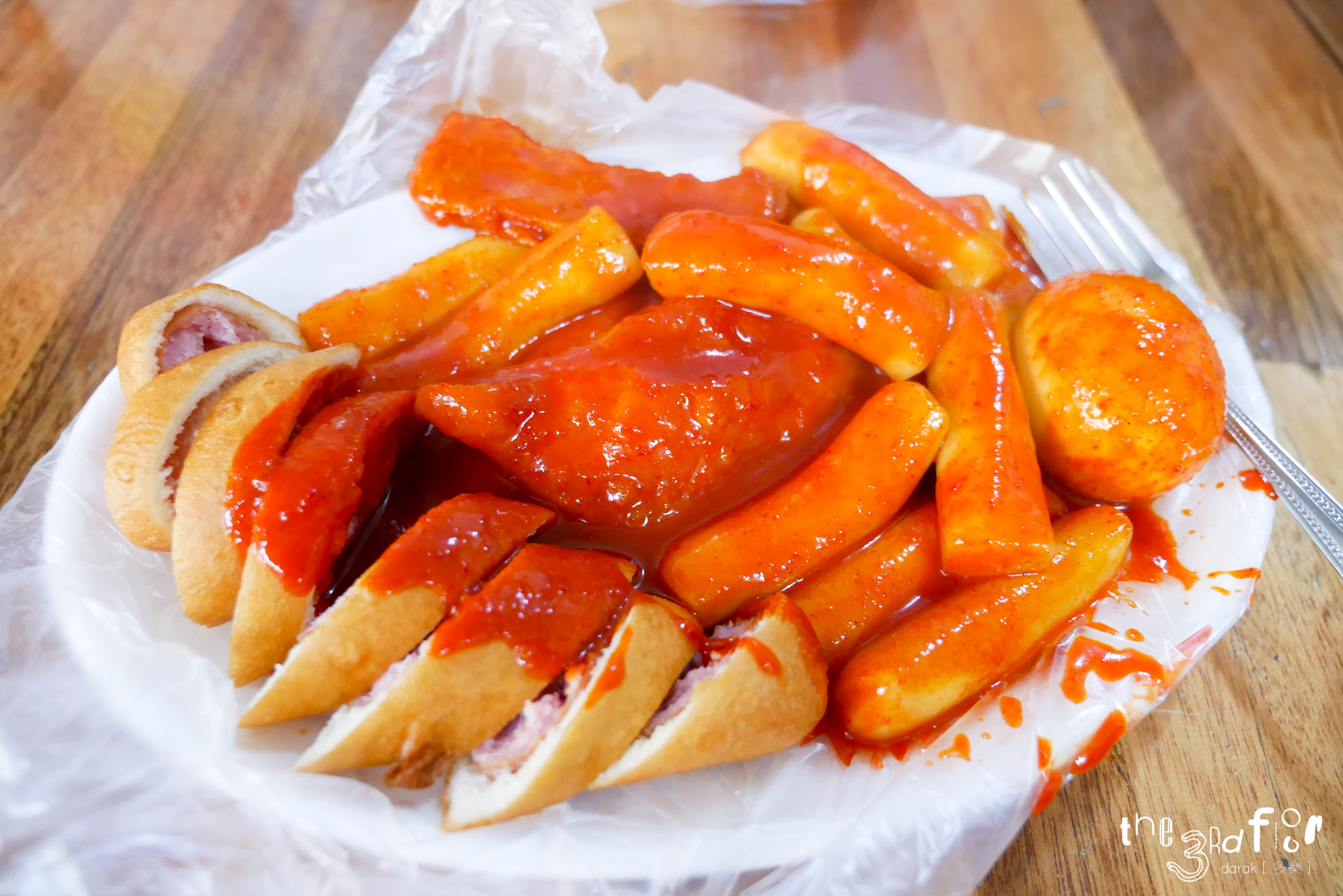 짜잔! 정석적인 1인세트. 핫도그, 떡볶이, 만두, 어묵, 계란이 하나씩 들어있다.