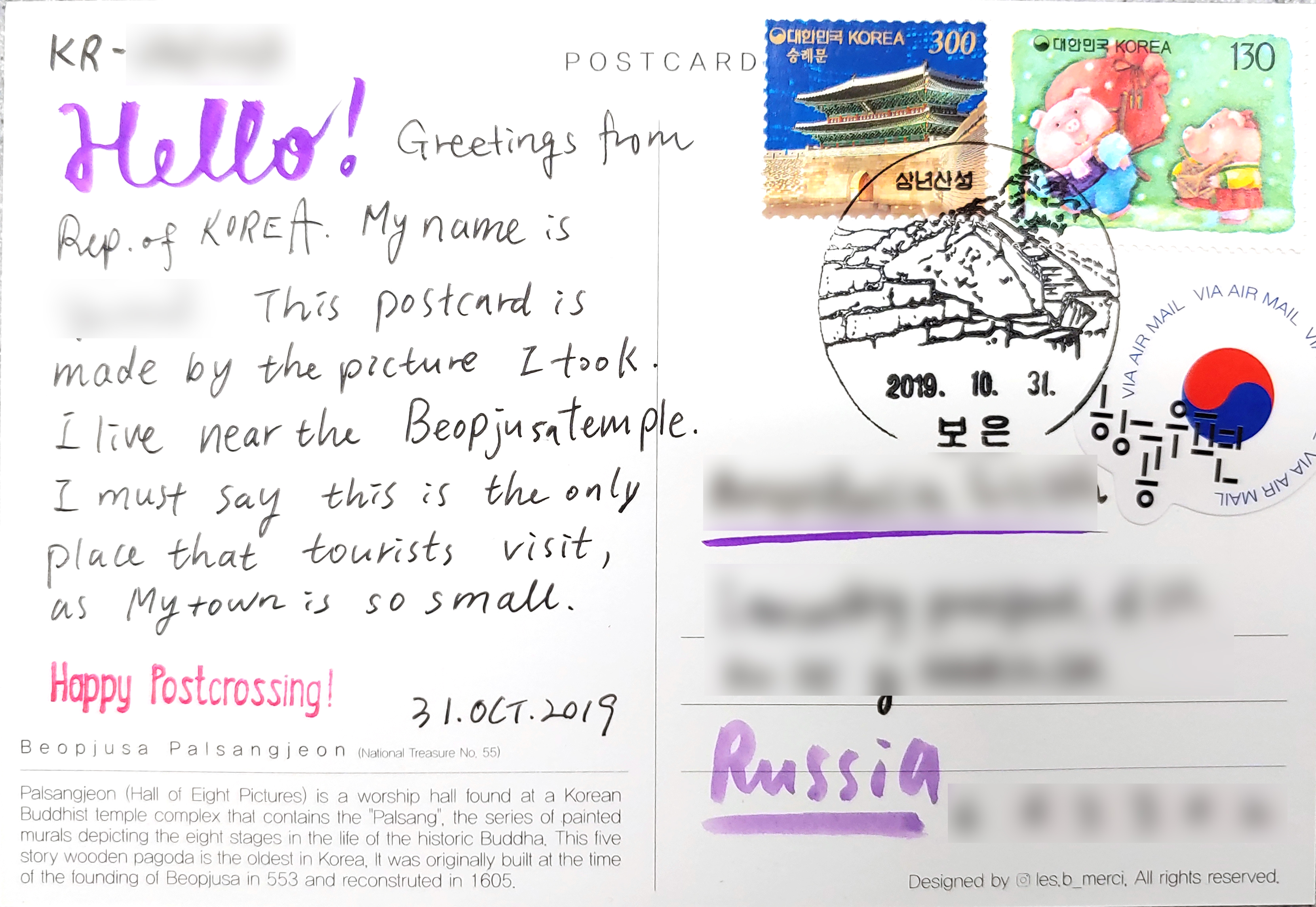 여섯번째 엽서는 법주사 팔상전으로 보내주었는데 세상에나 마상에나 지금 확인하니 도착을 하지 않아 등록되지 않은 채 만료되었다. 러시아나 중국은 분실이 잦아서... ㅜㅜ 어쩔 수 없지...