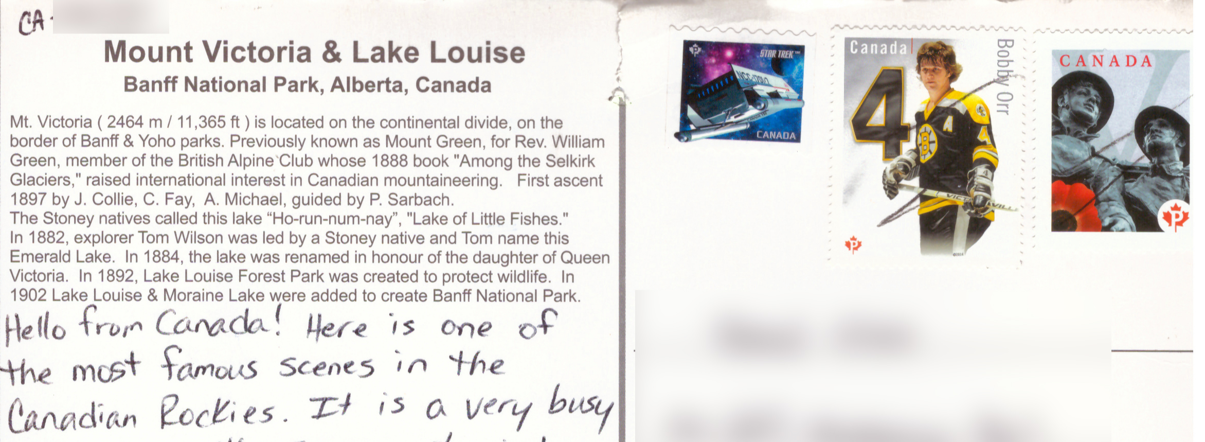 두번째 엽서는 캐나다에서 도착했다. 록키 산맥에서 가장 아름다운 풍경 중 하나라는데... 나는 록키 산맥을 거의 깔짝대듯이 봐서 이런 곳은 당연히 본 적이 없는 것으로...