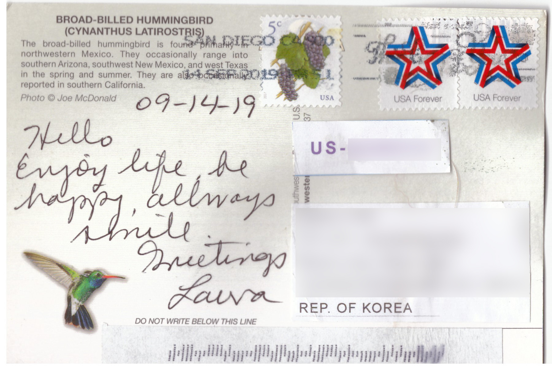 이 엽서는 2020년 1월이 되어서야 겨우 도착하게 되었다는;